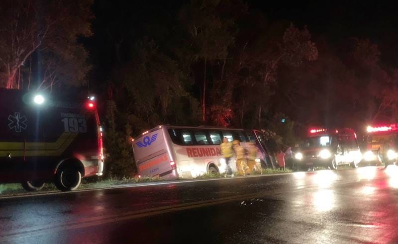 Um ônibus da empresa Reunidas, com cinco passageiros a bordo, sofreu uma avaria mecânica na direção e saiu da pista na BR-280, no km 154, em Mafra, na madrugada desta sexta-feira (12).