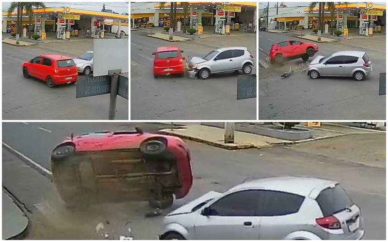 Imagens de uma câmera de segurança próxima ao local mostram que o Ford Ka invadiu a preferencial e colidiu na lateral do Fox. O impacto foi forte o suficiente para que o Fox capotasse.