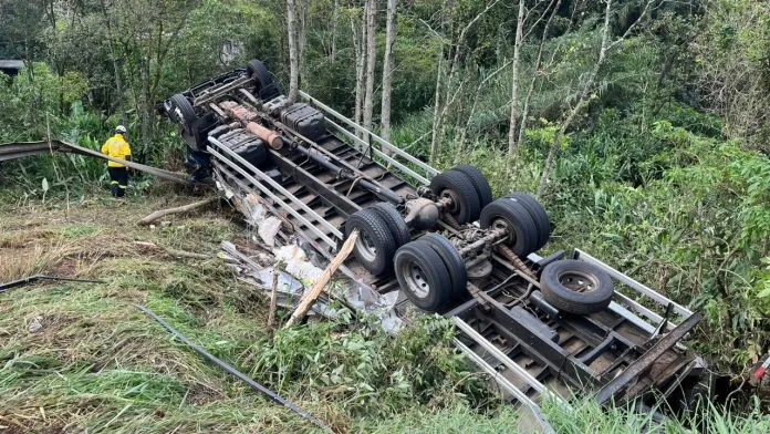 O caso ocorreu por volta das 13h30 desta sexta-feira (10). O caminhão chegou a ficar com as rodas para cima após o tombamento. O acidente ocorreu próximo à ponto do Rio Caçador, no contorno viário de Seara.