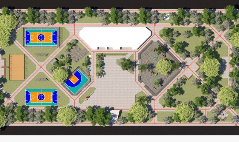 A praça terá novos espaços de lazer para toda a família: quadra poliesportiva, arquibancada, quadra de areia, quadra de basquete 3×3.