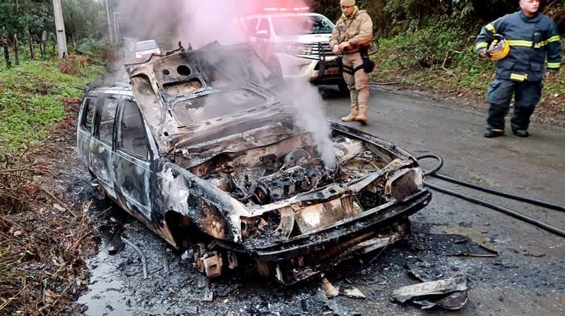 Um carro foi encontrado completamente tomado pelas chamas na manhã desta quarta-feira (17), na localidade de Campininha, em Três Barras. O incidente ocorreu por volta das 6h40min, na estrada geral do KM 06, próximo à Loja Maçônica.