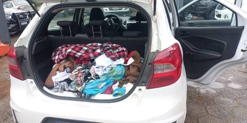 No veículo, foram encontradas diversas peças de roupa, algumas delas femininas e roubadas durante o crime da manhã.