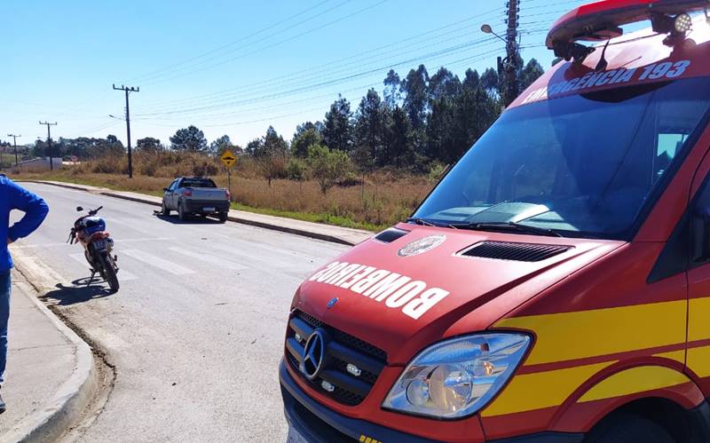 De acordo com informações do Corpo de Bombeiros, a colisão ocorreu na Rua Odilon Davet. Um veículo Fiat Strada e uma motocicleta Honda Bros 160 colidiram em via pública.