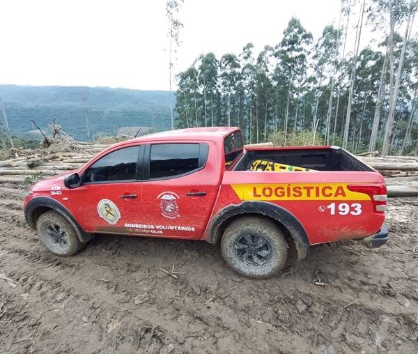 A equipe dos Bombeiros Voluntários utilizou um veículo com tração 4×4 para acessar a área do acidente, que se encontrava em uma ribanceira de difícil acesso devido ao relevo acidentado e às condições climáticas.