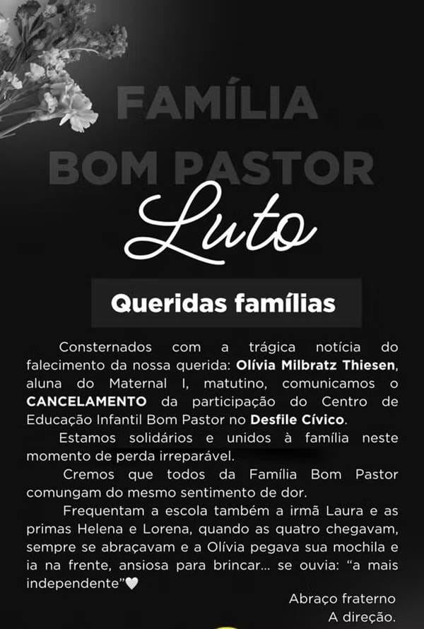A creche frequentada pela menina lamentou a perda da aluna “ mais independente” e prestou solidariedade aos familiares (imagem abaixo).