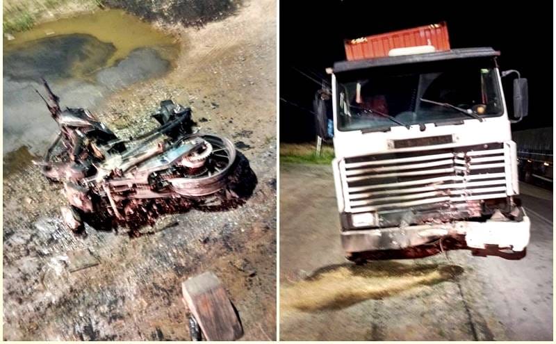 Um trágico acidente de trânsito ocorrido na noite de domingo (8), por volta das 21h, na BR-280, em Rio Negrinho, resultou na morte de um jovem de 19 anos. A colisão frontal entre uma moto Honda CB250F Twister e um caminhão Scania R-112 H foi seguida de um intenso incêndio que consumiu parte da motocicleta.