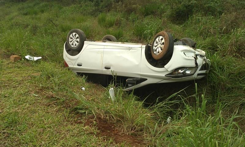 Ao chegar no local, os bombeiros encontraram um veículo Onix, de cor branca e placas de Canoinhas, fora da pista, em uma vala e capotado.