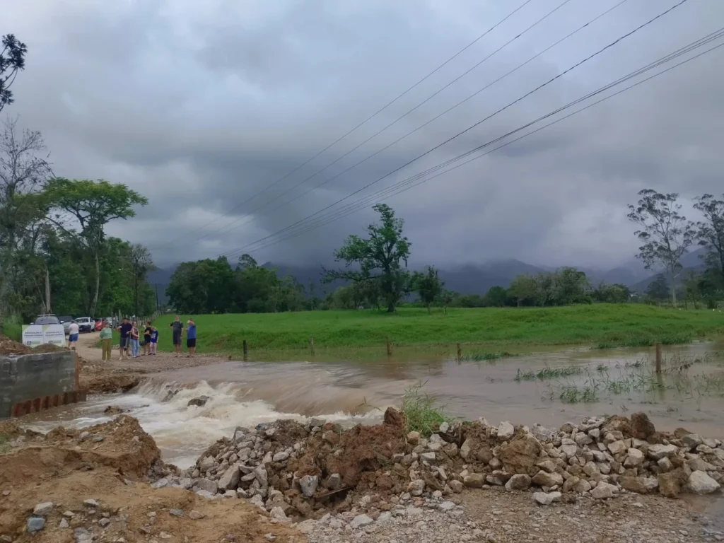 Em Biguaçu, um muro de contenção desabou devido ao solo encharcado, e a Defesa Civil precisou fornecer lona ao morador para proteger o barranco. O nível do rio subiu, invadindo algumas casas, mas a situação foi controlada.