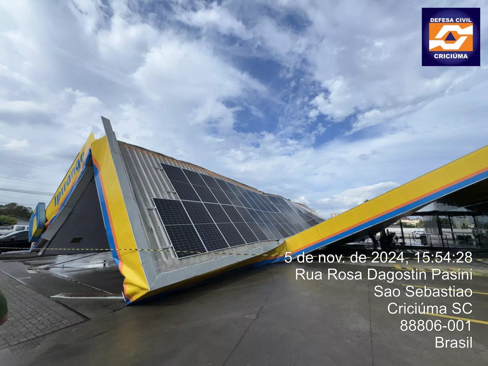 Em Criciúma, o telhado de um posto de combustíveis desabou com a forte chuva na tarde desta terça-feira (5). Ninguém ficou ferido. Além de Criciúma, outras cidades catarinenses tiveram danos por causa da chuva, principalmente na Grande Florianópolis.