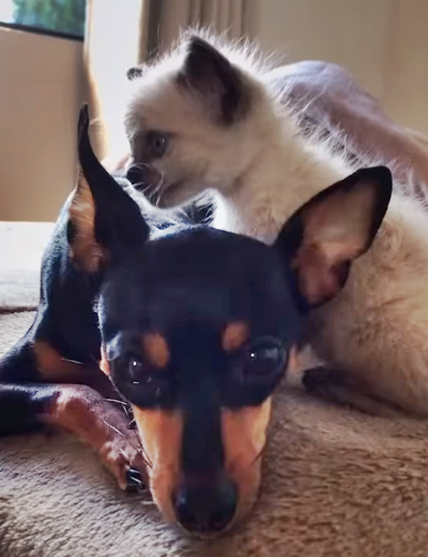A relação entre a pinscher e o gatinho reforça a ideia de que os laços de afeto podem surgir de maneira inesperada, trazendo à tona gestos de cuidado e amor que transcendem barreiras naturais.