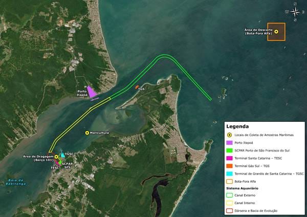 No entorno do Porto de São Francisco do Sul, a dragagem inclui a bacia de evolução, dársena e berços.