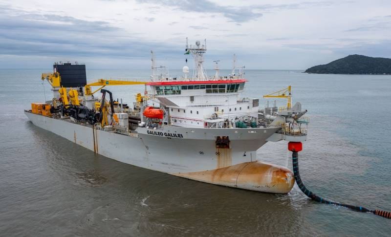 A draga da empresa Jan de Nul do Brasil é uma das mais modernas do mundo: tem 166 metros de comprimento e capacidade de carregamento de 18 mil metros cúbicos, equivalente a 1.800 caminhões trucados.