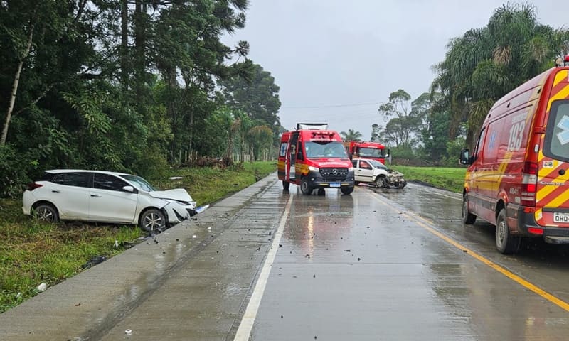 Na tarde deste sábado (14), um acidente de trânsito no km 15 da rodovia SC-477, entre Canoinhas e Major Vieira, mobilizou três viaturas do Corpo de Bombeiros para atendimento. O acidente envolveu uma colisão frontal entre um Fiat Palio e um Toyota Yaris.