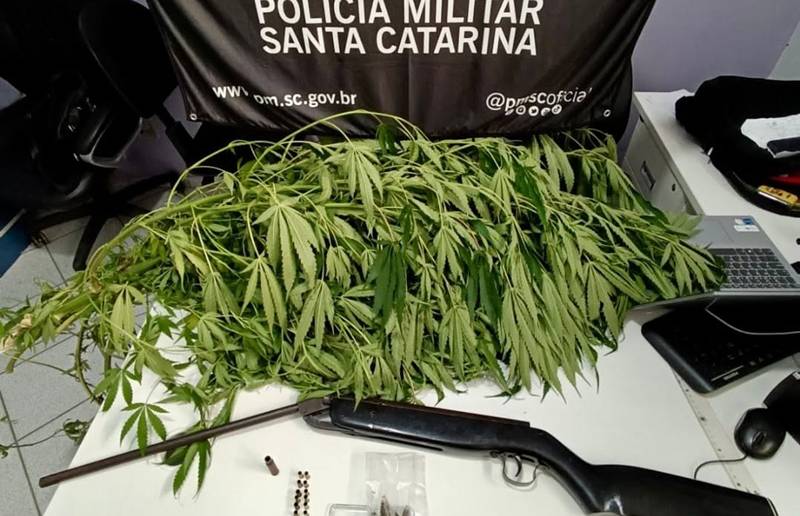 Os policiais também localizaram uma carabina de pressão modificada para calibre .22. O morador confessou ser o dono da arma e afirmou tê-la adquirido já modificada. Ele foi preso por posse ilegal de arma de fogo de uso restrito e encaminhado à delegacia. A planta de maconha foi apreendida.