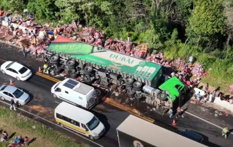 Segundo a Polícia Rodoviária Federal (PRF), o motorista não ficou ferido. Em imagens registradas por drone, é possível ver que grande parte das bebidas ficou espalhada pela pista e no canteiro lateral.