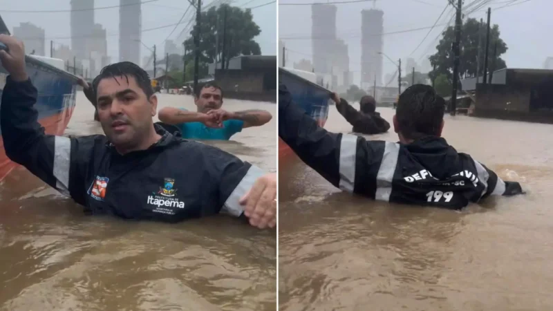 O prefeito de Itapema, Alexandre Xepa, utilizou as redes sociais nesta manhã para pedir ajuda no resgate de pessoas na cidade. Nas imagens, Xepa aparece com a água quase atingindo seu pescoço, mostrando a situação causada pelas fortes chuvas que atingiram a cidade.