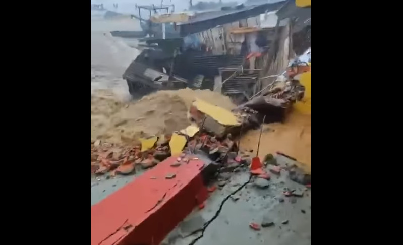 “Nesse exato momento, acabou de cair a estrutura da parte de trás do quartel. Acabou de cair, não sobrou nada. A chuva está muito forte, tá levando tudo”, diz o narrador.