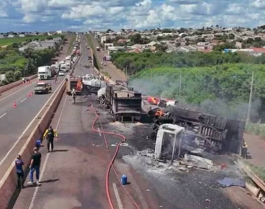 Uma batida entre três caminhões e uma máquina de obra asfáltica provocou um incêndio na tarde desta terça-feira (25) na BR-376, em Maringá, no norte do Paraná. Por conta do acidente, o trecho foi interditado. Em imagens registradas no local, é possível ver que uma fumaça preta toma conta da rodovia (assista no vídeo abaixo).