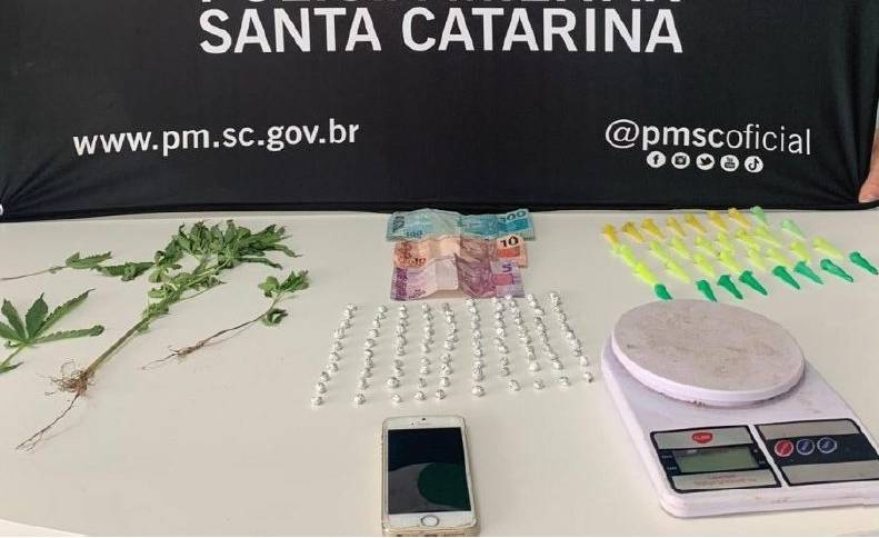 Com a autorização do adolescente e de sua irmã, representante legal, a guarnição entrou na residência do menor, onde foram encontrados uma balança de precisão, 32 pinos vazios e três pés de maconha, dos quais o adolescente assumiu a propriedade.