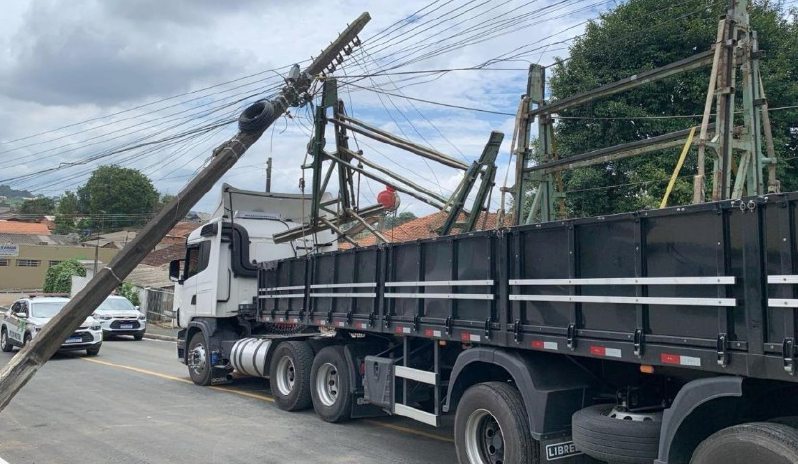 A Polícia Militar foi acionada para atender a ocorrência e constatou que a carga do veículo havia enroscado nos fios de internet e telefonia, derrubando um poste de energia elétrica.