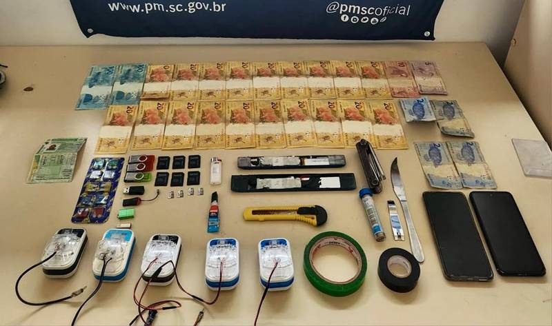 Durante a abordagem, os policiais realizaram revista veicular e encontraram malas de viagem, carregadores de celular, pendrives, fusíveis, fita isolante, fita dupla face, cartão de memória, adaptador, algumas ferramentas e a quantia de R$ 603,00 (seiscentos e três reais) em espécie.