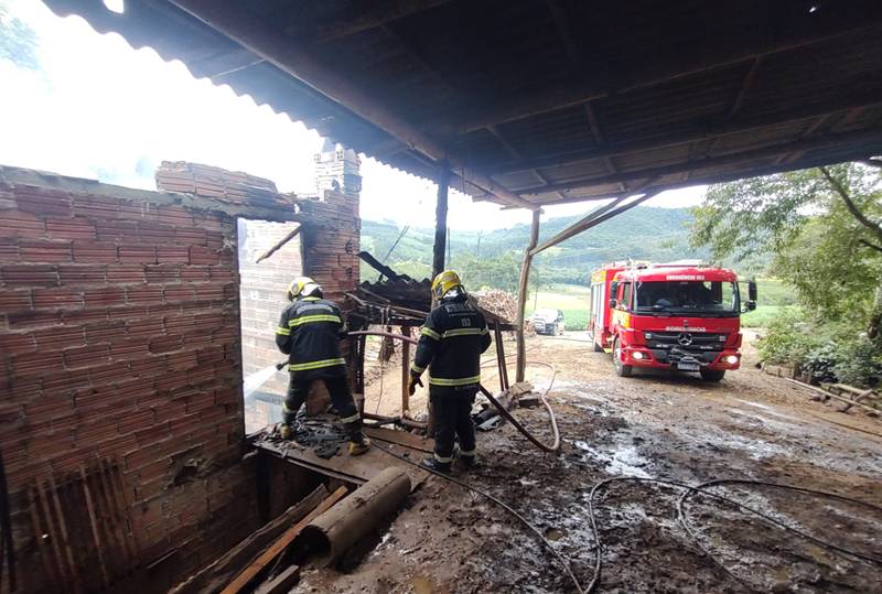 A construção, com aproximadamente 40 m² e carregada com folhas para secagem, já se encontrava com o fogo em fase final quando os profissionais chegaram ao local.