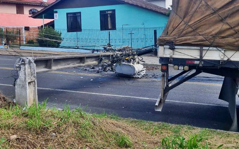 De acordo com o relato do motorista, a parte traseira do caminhão enroscou no poste, causando a quebra e a queda da fiação elétrica. O poste, que continha um transformador, começou a vazar óleo, representando risco de incêndio, informou o Corpo de Bombeiros.