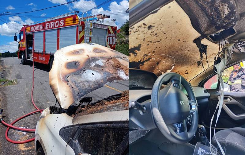 Ao chegar ao local, os bombeiros confirmaram um incêndio em desenvolvimento em um veículo Peugeot 208. A equipe realizou o gerenciamento de risco e iniciou o combate ao fogo, que se concentrava no compartimento do motor e no painel interno do carro.
