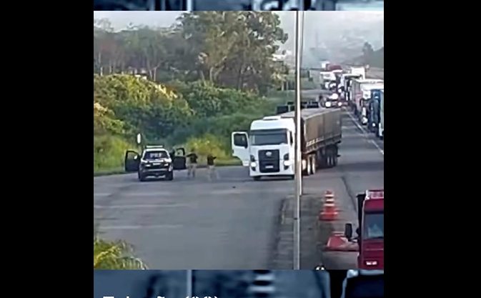 Ao perceber a barreira, no entanto, o motorista desviou pelo acostamento, abriu a porta e pulou do caminhão ainda em movimento, correndo em direção a um matagal.