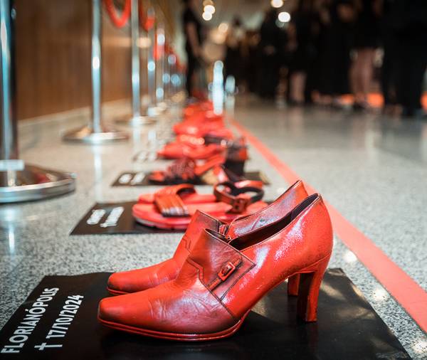 Durante o ato, mulheres vestidas de preto colocaram 51 sapatos femininos vermelhos em frente à galeria de presidentes da Alesc, representando as vítimas.