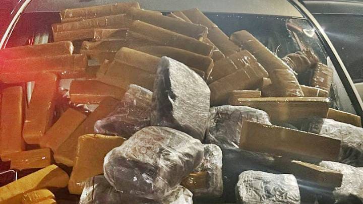 Após a indicação, os policiais realizaram uma busca minuciosa no interior do veículo e encontraram um fundo falso contendo aproximadamente 60 kg de maconha e 5 kg de skank.