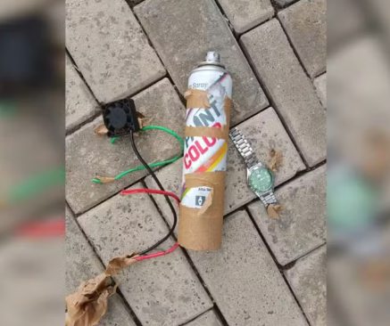 A Polícia Militar foi acionada após uma denúncia, mas descobriu que o objeto suspeito era, na verdade, uma lata de tinta embrulhada em papel, com um relógio e uma ventoinha.