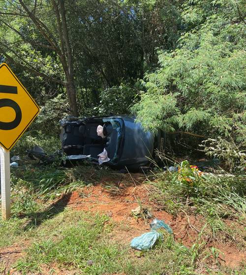 O veículo encontrava-se fora da pista em um barranco, com colisão frontal. O condutor, um homem de 28 anos, estava sentado na lateral da pista, consciente, mas desorientado, com ferimento corto-contuso no crânio, suspeita de TCE, fratura no arco costal direito e ferimento lacerante no membro superior esquerdo. Foi encaminhado ao Pronto Atendimento de Canoinhas.