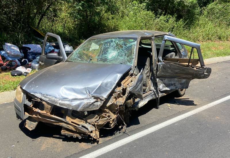 O veículo estava no acostamento, com colisão frontal e lateral esquerda, contendo quatro vítimas: