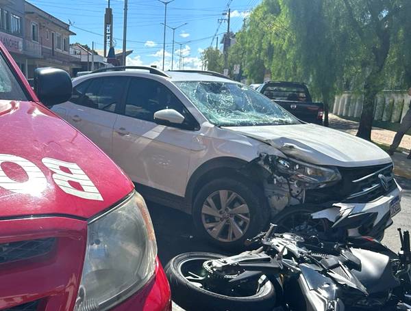Um acidente de trânsito envolvendo um carro e uma motocicleta deixou duas pessoas feridas na tarde desta sexta-feira (14), na Avenida José Severiano Maia, bairro Buenos Aires, em Mafra. O motociclista, um jovem de 20 anos, foi arremessado para cima do capô do carro após a colisão frontal.