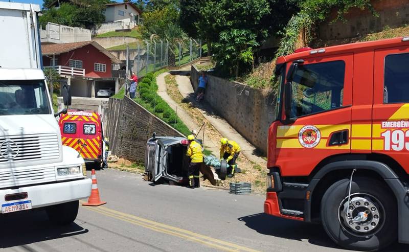Um capotamento de veículo na Rua Schramm, próximo à EBM Henrique Schwarz, em São Bento do Sul, mobilizou as equipes do Corpo de Bombeiros Militar nesta quinta-feira (6). Apesar do susto, a motorista do veículo saiu ilesa do acidente.
