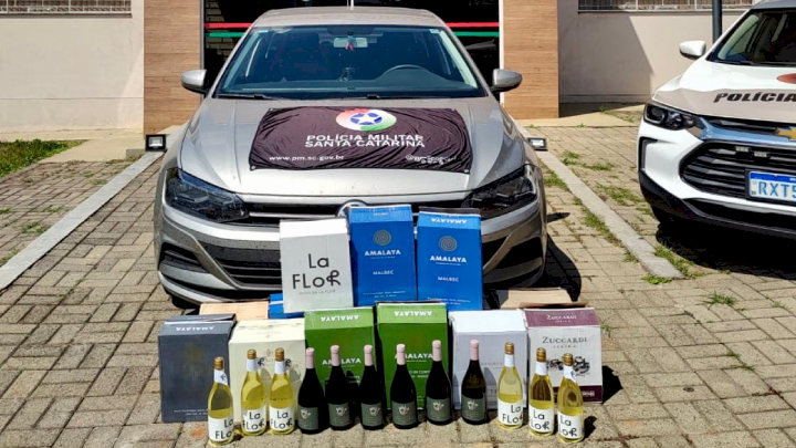 Após receber uma denúncia, os policiais militares realizaram a abordagem de um veículo e, durante a busca veicular, foram localizadas, no porta-malas, 16 caixas de vinho (96 garrafas) todas de marcas diversas e com origem argentina, que estavam sendo transportadas de maneira ilegal.