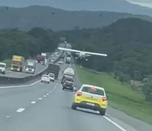 O momento em que a aeronave desvia de cabos de alta tensão e, por pouco, não atinge um caminhão foi filmado por ocupantes de um veículo que passava na rodovia, gerando grande susto.
