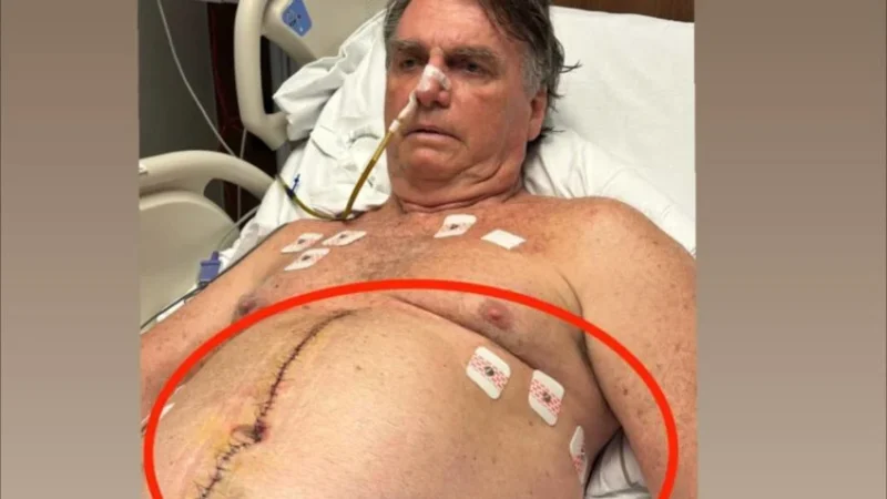 A intervenção cirúrgica foi necessária devido a complicações decorrentes da facada sofrida durante a campanha eleitoral de 2018. A imagem mostra os pontos na barriga do ex-presidente, além de um dreno próximo à área operada.