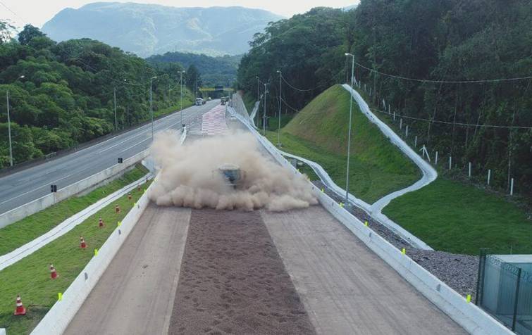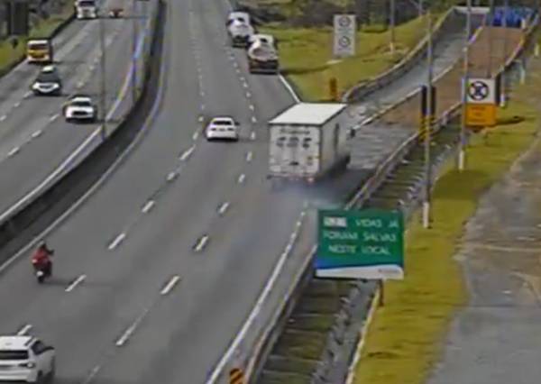 Imagens registradas pela Arteris Litoral Sul, concessionária responsável pela administração do trecho, mostram o momento em que fumaça emanava das rodas do caminhão durante a manobra de entrada na área de escape.