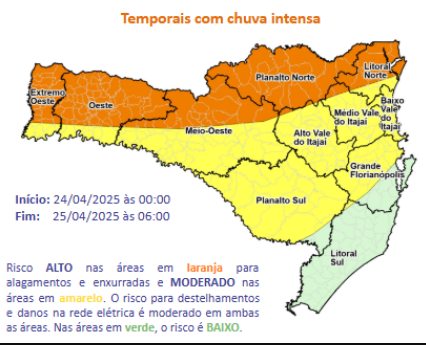 No decorrer do dia, a chuva avança principalmente para as regiões entre o Grande Oeste, Planalto Norte, Vale do Itajaí e Litoral Norte, trazendo risco para ocorrências associadas aos temporais nestas áreas.
