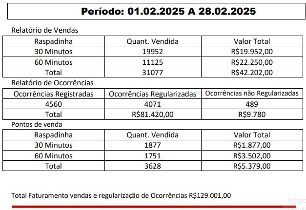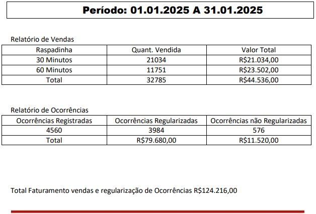Segundo os relatórios disponibilizados pela empresa (veja na imagem abaixo), em janeiro foram vendidas 32.785 mil raspadinhas, que dão direito ao estacionamento por períodos de 30 minutos ou uma hora. O valor arrecadado com essas vendas foi de R$ 44.536,00, enquanto as regularizações das notificações renderam R$ 79.680,00.