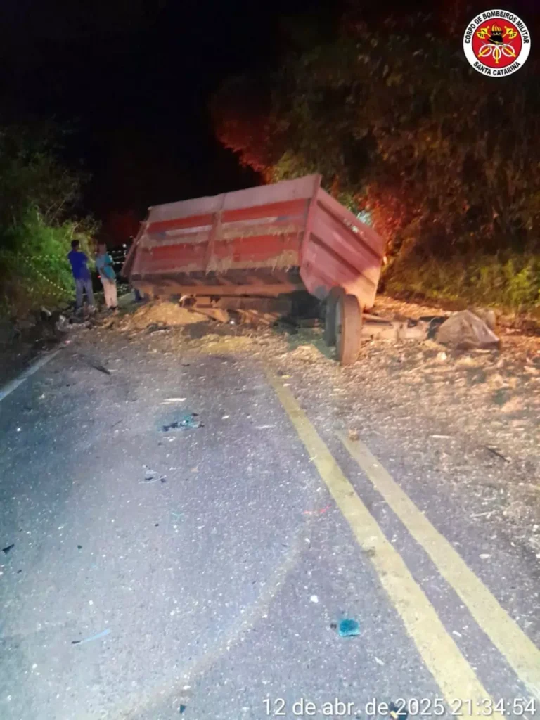 Uma colisão entre um carro e um trator agrícola deixou um homem morto na SC-464 em Salto Veloso, no Oeste de Santa Catarina. O acidente ocorreu na noite de sábado (12).