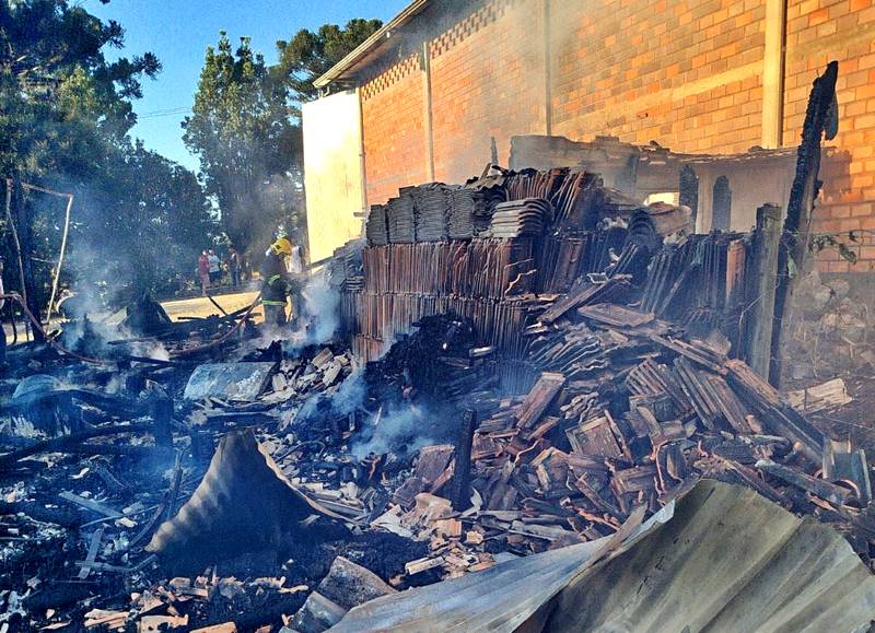 No interior do galpão principal, foram destruídos pelo fogo uma caminhonete e diversos materiais armazenados, como caixas de madeira, lenha, recipientes plásticos e outros itens em desuso.