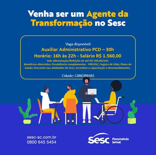 A unidade do Sesc em Canoinhas está com vaga aberta para Auxiliar Administrativo, exclusiva para Pessoas com Deficiência (PCD) ou Reabilitados do INSS. A carga horária é de 30 horas semanais e a remuneração é de R$ 1.560,00 + benefícios.