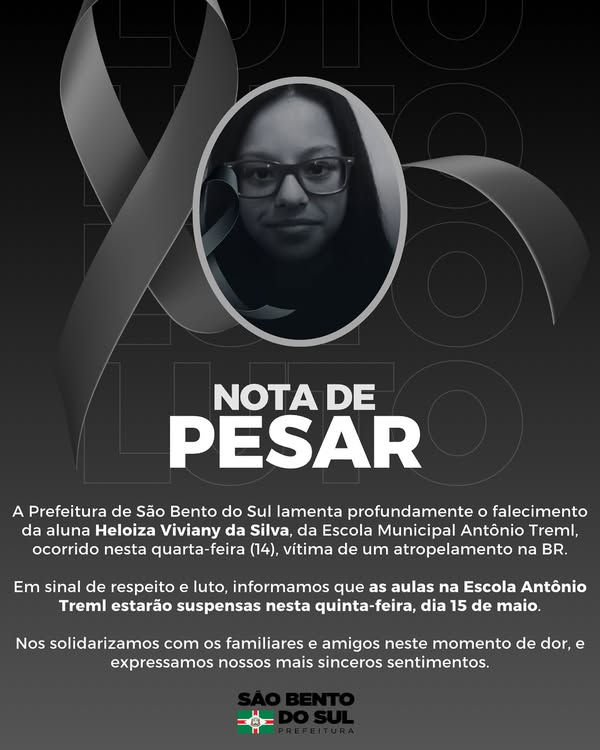 “A Prefeitura de São Bento do Sul lamenta profundamente o falecimento da aluna Heloiza Viviany da Silva, da Escola Municipal Antônio Treml, ocorrido nesta terça-feira (14), vítima de um atropelamento na BR ao sair do ensaio da Banda Escolar.