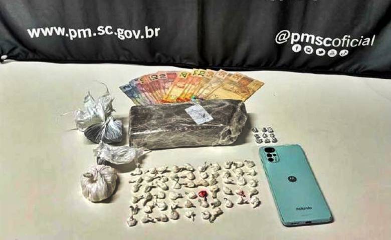 Na abordagem e busca pessoal, foram encontradas 32 gramas de substância análoga à maconha no bolso da jaqueta do jovem, além de um aparelho celular e R$68,00 em dinheiro. Com a outra envolvida, uma adolescente de 15 anos, foram localizadas 4 gramas da mesma substância no bolso de sua calça.