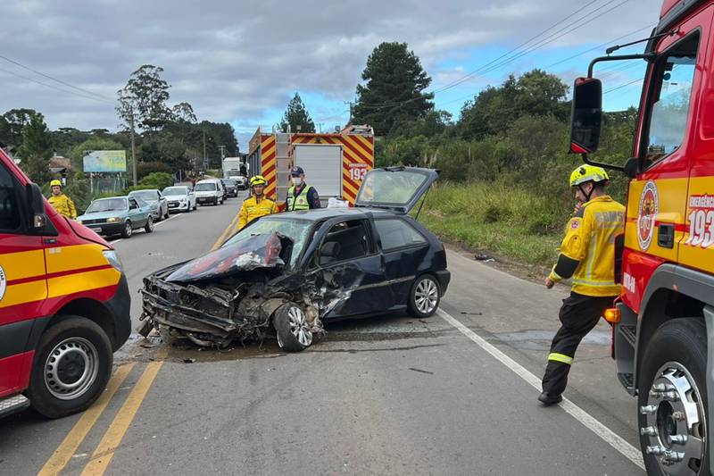 Ao chegarem ao local, os bombeiros constataram que o condutor do veículo de passeio, um VW Gol, estava preso às ferragens.
