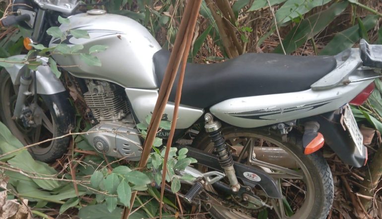 Ao chegar no local, os policiais seguiram vestígios de movimentação recente, como cercas cortadas e vegetação amassada, até localizar a primeira motocicleta, uma Suzuki com a placa parcialmente adulterada com fita isolante. O veículo havia sido furtado no dia 11 de maio.