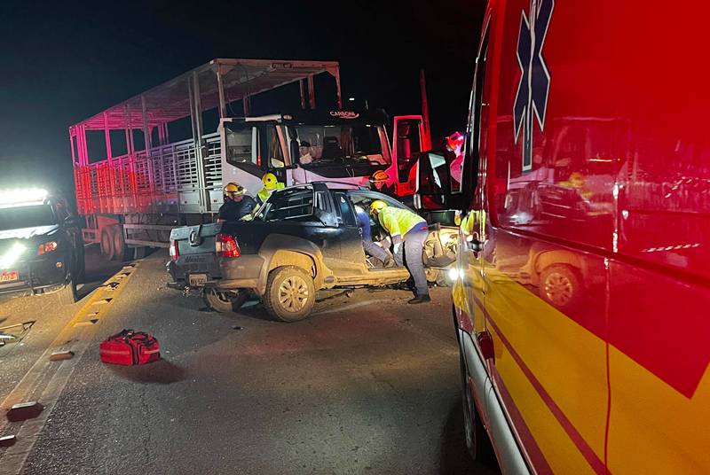 Uma colisão frontal entre um caminhão Iveco e uma caminhonete Fiat Strada Adventure deixou o motorista da caminhonete, de 67 anos, com ferimentos graves.